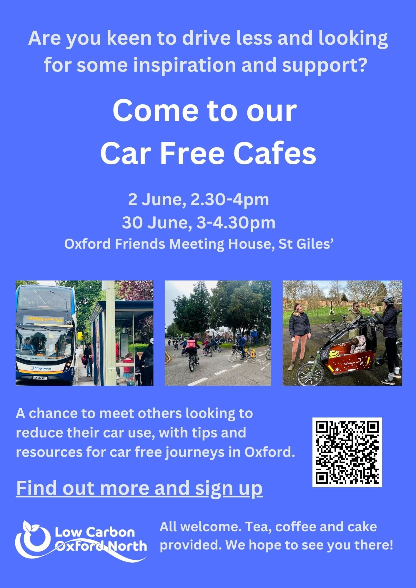 To share these findings and support those wishing to reduce their car use LCON are running two free ‘CarFree Cafes’, on 2 and 30 June at the Oxford Friends Meeting House on St Giles’. These will be an opportunity to hear from residents who have reduced their car journeys, share lessons from the Oxford Car Free Challenge, and talk to the Oxford Car Free Challenge team about specific questions and challenges. You can find out more and register through Eventbrite.