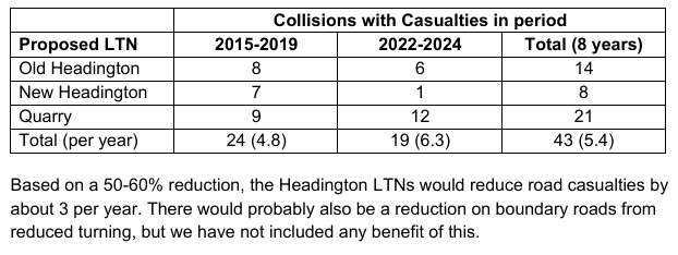 A key aim and proven benefit of LTNs is improved safety, particularly for children, disabled people and all people who cycle, walk or wheel. CoHSAT's analysis shows that the Headington LTNs, which were due to be implemented in 2022, would reduce road casualties by about 3 per year, possibly more.