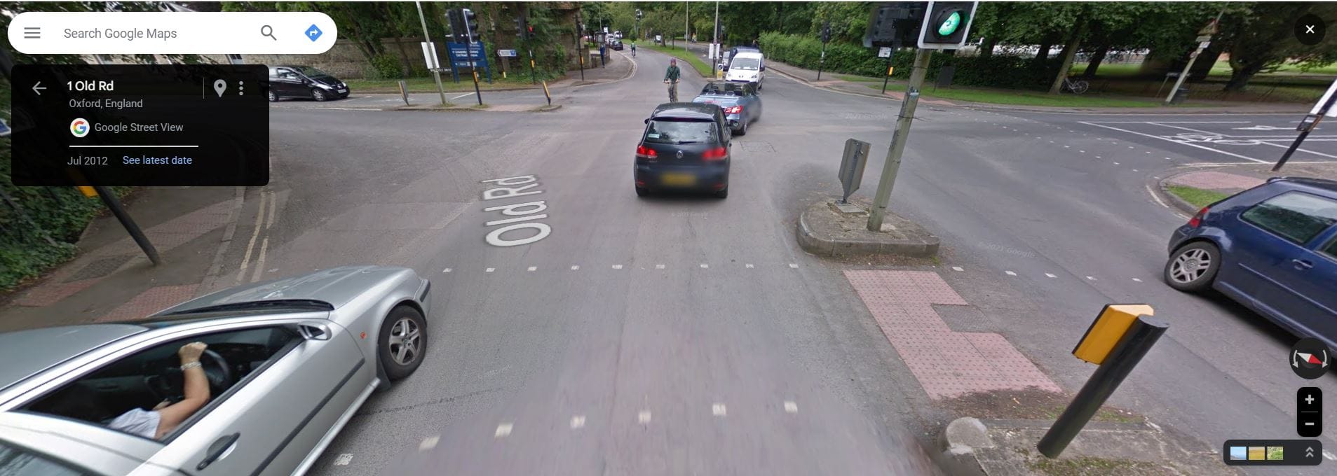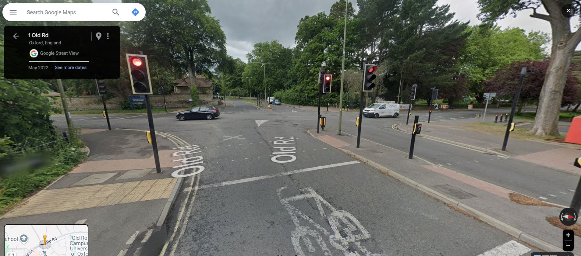 - Currently it is a horrible junction to navigate by walking, cycling, wheelchair or mobility scooter, with long wait times to cross (and in the case of Warneford Lane and Old Road having to cross in two stages via precarious narrow strips), tight obstructed pedestrian islands and no safe way of turning right by bike. The Access to Headington changes prioritised motor traffic by building a new lane to exit from Roosevelt Drive, increasing the length of the approach lane on Old Road and creating staggered right-angle pedestrian islands where before they were straight crossings with no turns. (Compare before and after images below.)
